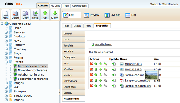 In the following example, you will learn how to add attachments to a document via the Properties -> Attachments tab and display them on the live site. We will use the Events section of the sample Corporate Site. First, we will upload the attachments to some of the events in the section. Then we will add the Attachments image gallery web part to the Events page, which will display the attachments for each displayed event.