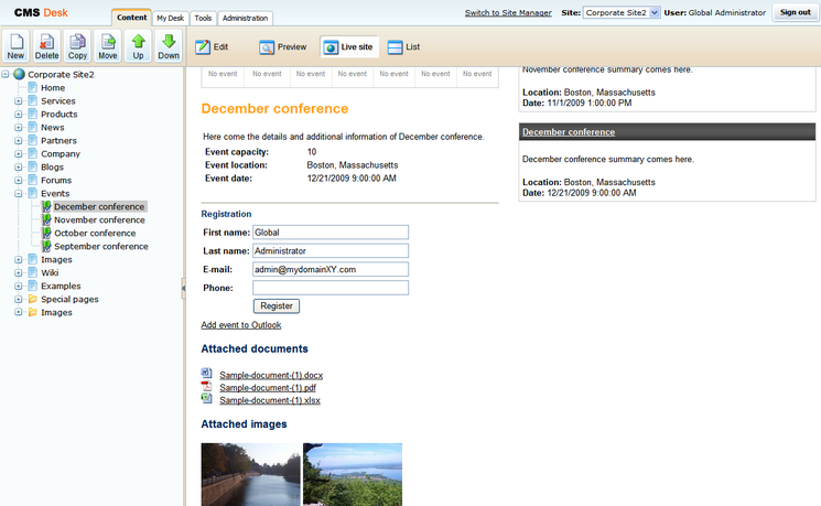 In this example, you will learn how to add two Document attachments fields to a document type and how to use them on the live site. Again, we will use the Events section of the sample Corporate Site. So if you completed the previous example right before, please delete the Document image gallery web part from zoneLeft in order to get the page to the original appearance.