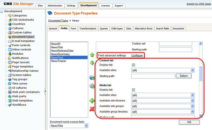 | • | Available sites: defines which sites' content trees will be available in the dialogs |