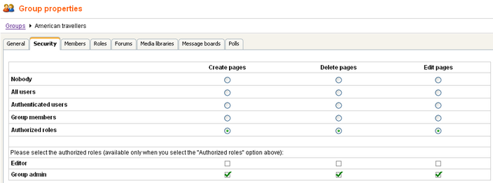 On this tab, you can see a list roles defined for the group. These roles are applicable only in the context of the group. Don't confuse them with web site roles, which can be set in Site Manager -> Administration -> Roles.
