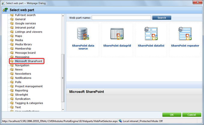 The whole integration functionality is provided by the following web parts from the Microsoft SharePoint category: