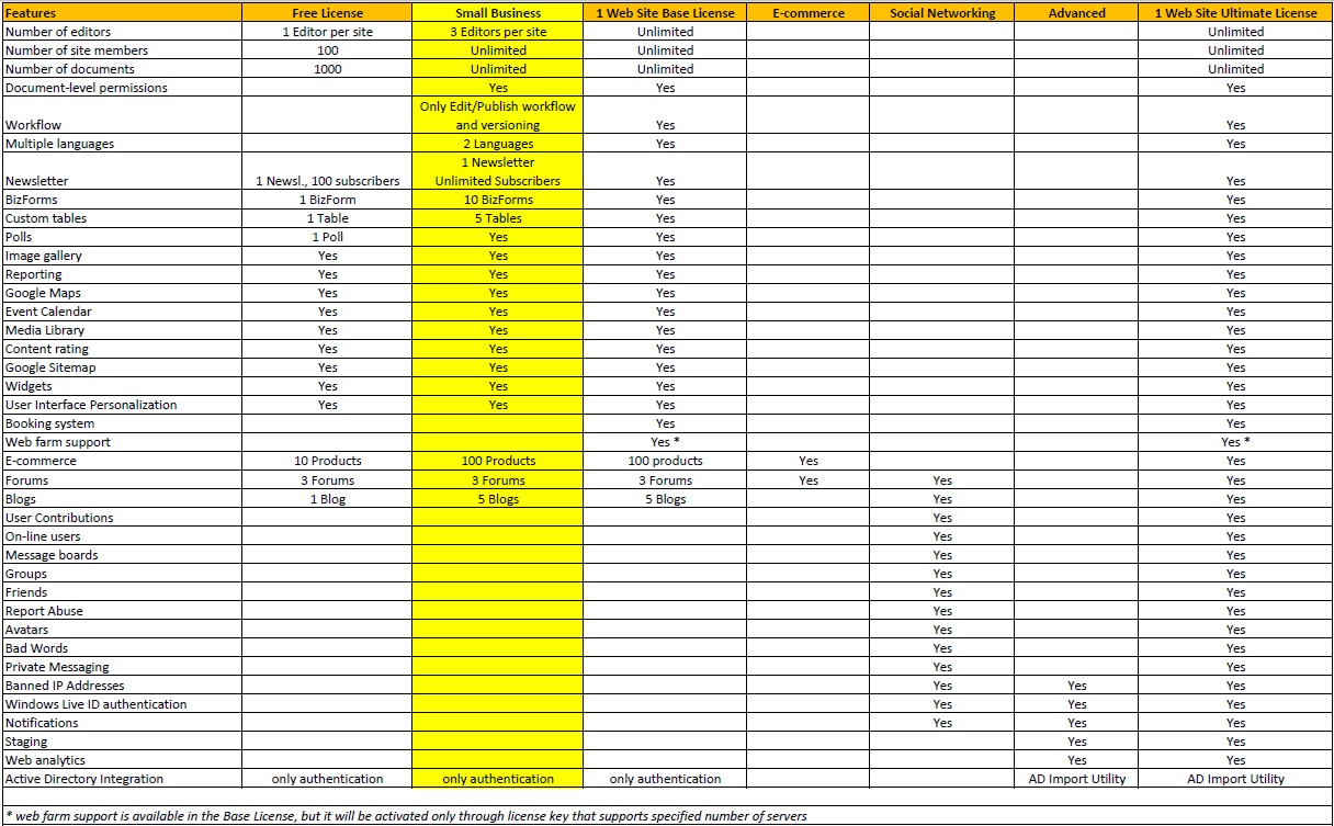 I would like to say thank you to all partners who filled out our survey. Based on their feedback, we defined the following feature set for the Small Business License (click the image to enlarge):