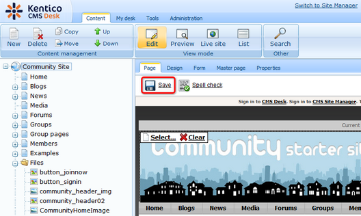 Changing the header image is a procedure of a few clicks. You only need an image of the same width as the original image, which is 960 pixels. For the purpose of this example, you may use the community_header02.gif. The file can be found in the attached files package that can be found at http://www.kentico.com/Downloads/CommunityGuide/CommunitySiteGuide_files.zip. Once you have the image prepared, follow these steps: