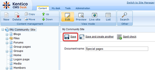 2. Enter Special pages into the Document name filed and click Save.