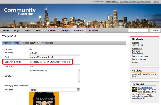You can let users specify who will see particular details on their public profiles. By default, this is enabled for the e-mail field, as you can see in the screenshot below. Using the highlighted radio-buttons, users can make their e-mail address visible to:
