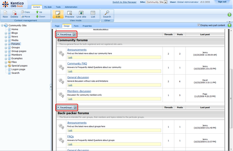 Forums management can be performed in CMS Desk -> Tools -> Forums. On the page, you can see a list of existing forum groups. By clicking the Edit (