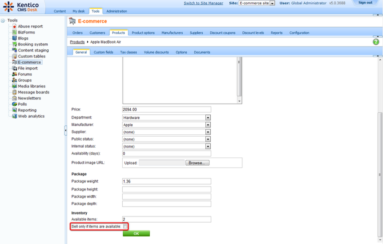 For enabling this option, you have to enter the number of available items into the Available items text box and check the Sell only if items are available checkbox. An order is accepted only if the number of ordered items is no greater than the number of available items.