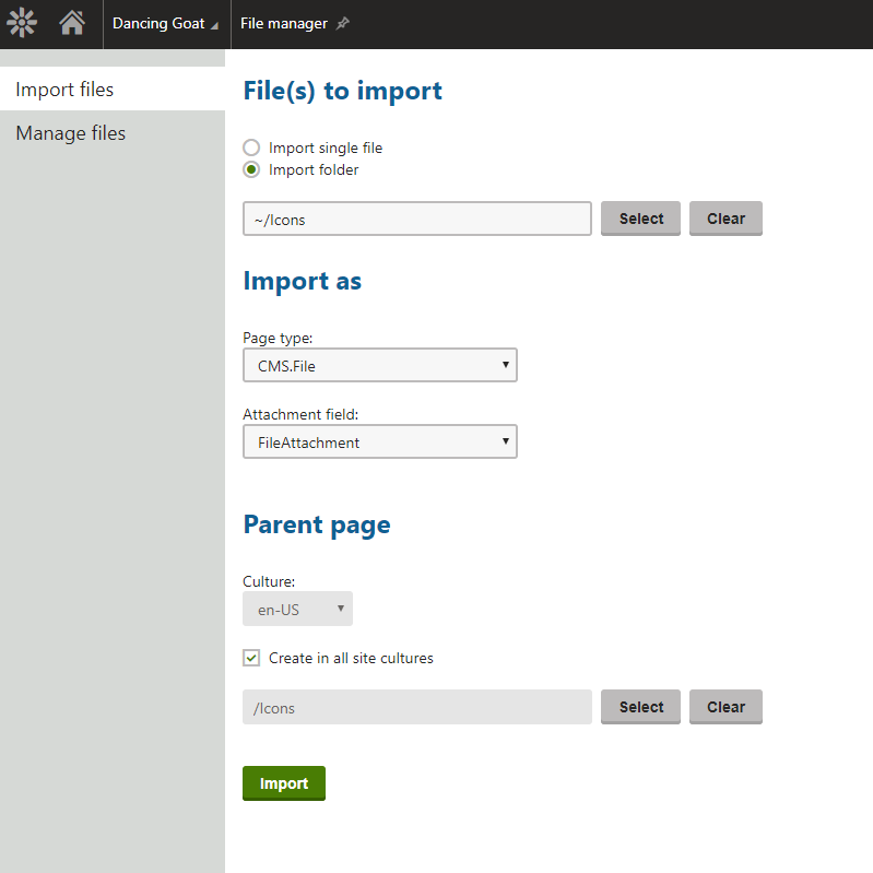 You can choose to import the files as CMS.File page types, or any other page type which has a field with the File data type. Then, select a parent node to add the new pages as children. You can choose to create the pages in a single culture, or all cultures assigned to the current site.